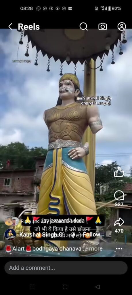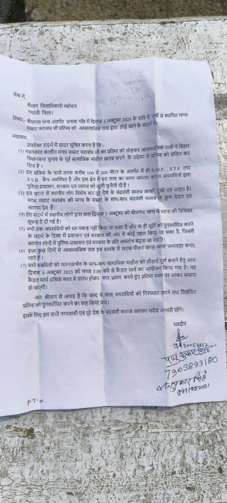 धनावा, बोधगया बिहार में 5 अक्टूबर 2025 को असामाजिक तत्वों द्वारा मगध सम्राट जरासंध महाराजा के मूर्ति को क्षतिग्रस्त करने के विरोध में पूरे भारत में चंद्रवंशी क्षत्रिय समाज के व्यक्तियों द्वारा विरोध प्रदर्शन किया गया